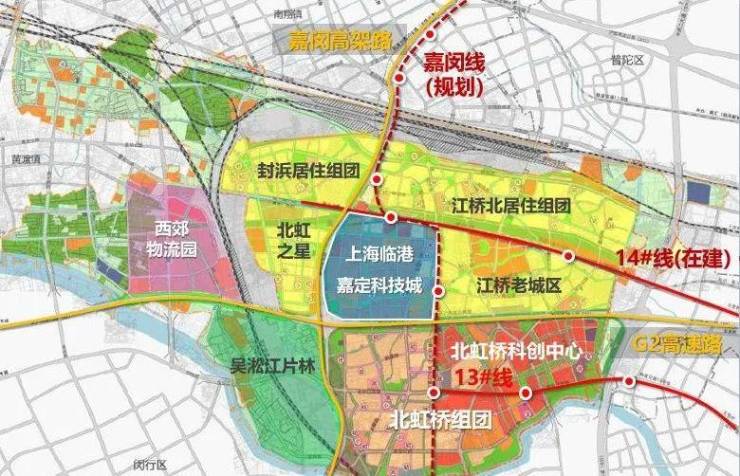 虹桥国际中央商务区北虹桥片区嘉定江桥地区前不久已最新重磅发布了嘉定江桥北虹桥片区“一核、一带、三轴、四区”最新布局规划(如图):