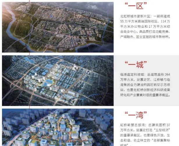 “四区”即上虹桥片区、星云湾片区、江桥里片区、星汇谷片区,分别承担了跨界起航、产城融合、老镇提升、森林总部四大功能,城市设计上更加注重创新突破,打造符合虹桥国际开放枢纽定位的城市形象。