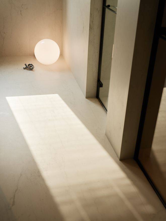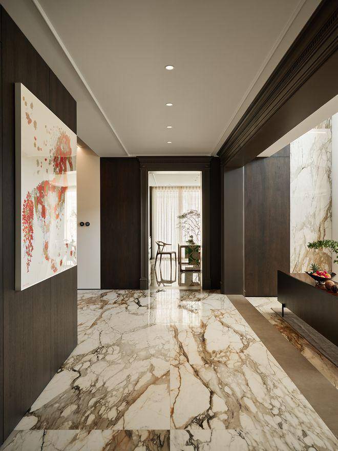 打开这幢别墅的大门,走入的是艺术和情感的殿堂。玄关处吴昊宇艺术作品《新石器》与范思哲的永恒系列地砖共同谱写的时光主题。