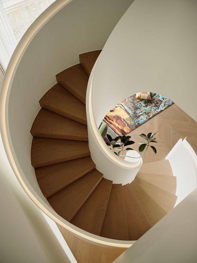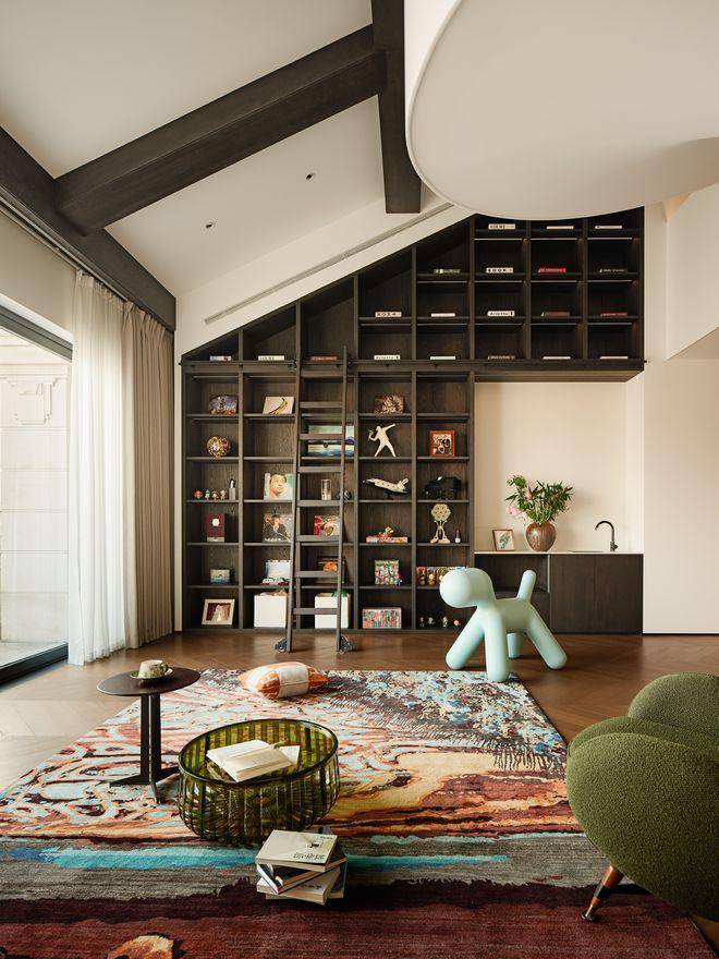 房子内部以“垂直生长”回应家族生命周期。一楼作为家庭社交中枢,6米多高的挑空客厅以卡拉卡塔金大理石纹为幕,石材纹理如水墨恣意流淌,灰色的手工地毯以“时光的褶皱”为精神内核,与Minotti的家具构成刚柔对话。