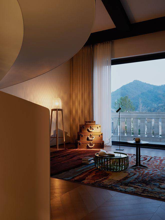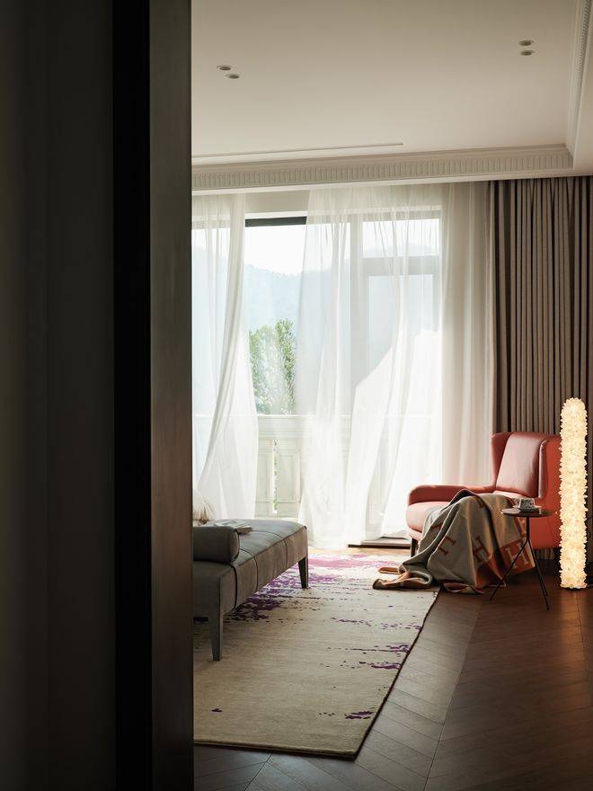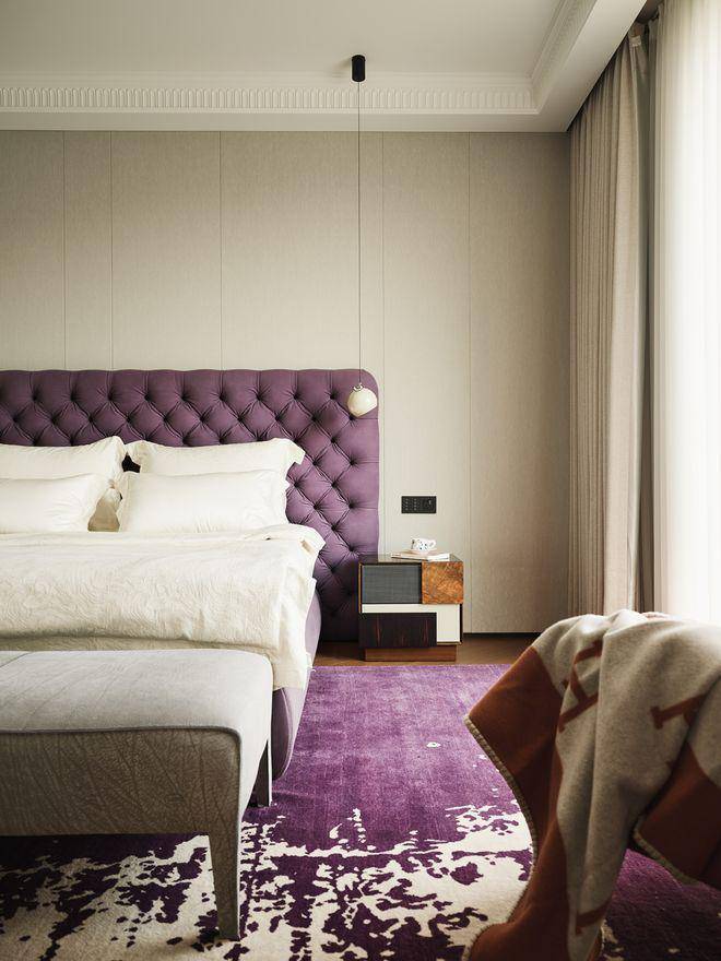 三楼围绕家庭起居厅布置卧室。卧室的地毯是由黄亚兰原创设计的《流动的暮色诗境》,精致的家具与手工羊毛地毯温柔包裹新生家庭的私密时光。
