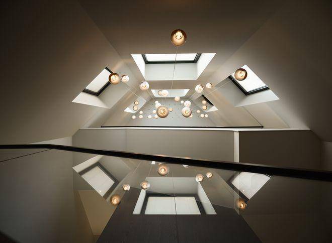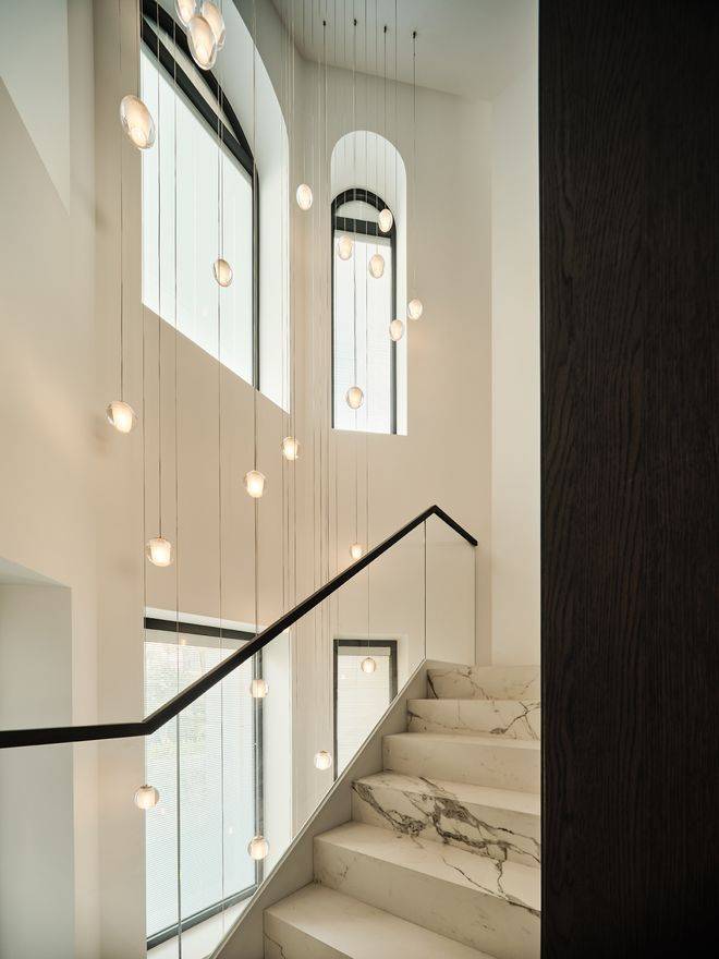 楼梯间水晶灯装置模拟雨滴下坠的瞬间动态,与旋转楼梯的几何韵律共奏空间序曲。