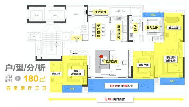 建面约180㎡ 的终极改善户型为4房2厅3卫的设计,五开间朝南,南向开间达到了惊人的近18m;