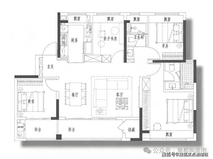 三开间朝南,搭配多处飘窗和阳台,能充分引入自然光线,使室内空间明亮通透,同时也能带来较好的景观视野.