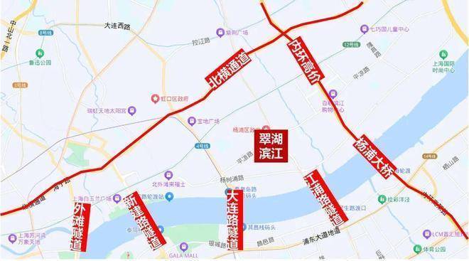 交通方面, 周边1公里内有多条轨道交通,东侧约400米有18号线平凉路站,西侧约700米是4号线杨树浦路站,西北侧1公里为4、12号线大连路站。地块到东外滩滨江的直线距离约580米。