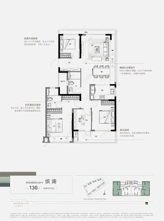 户型:主力为建面96-130㎡三至四房,精装标准含地暖、中央空调等