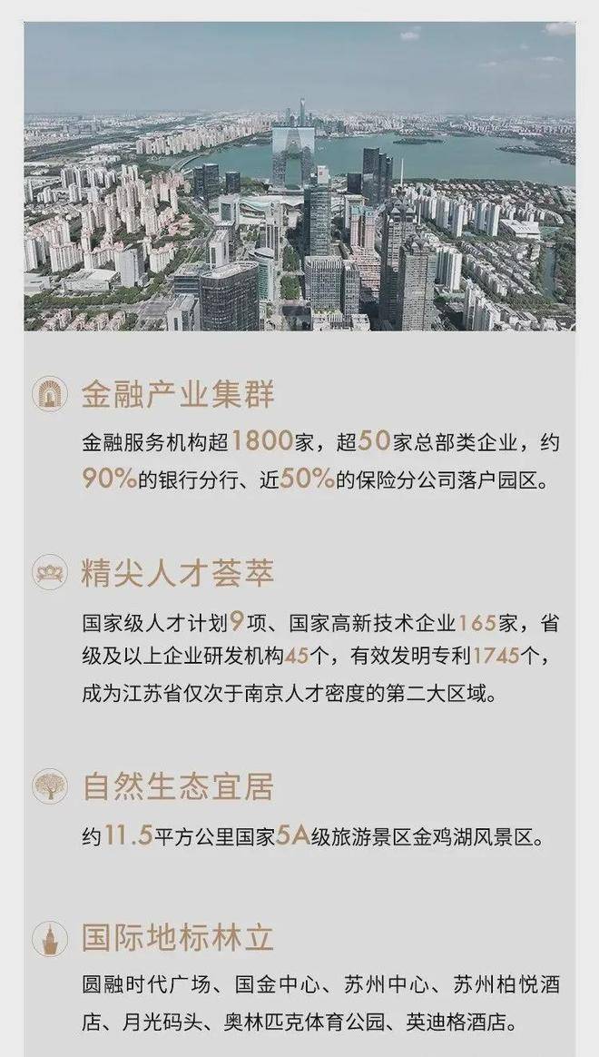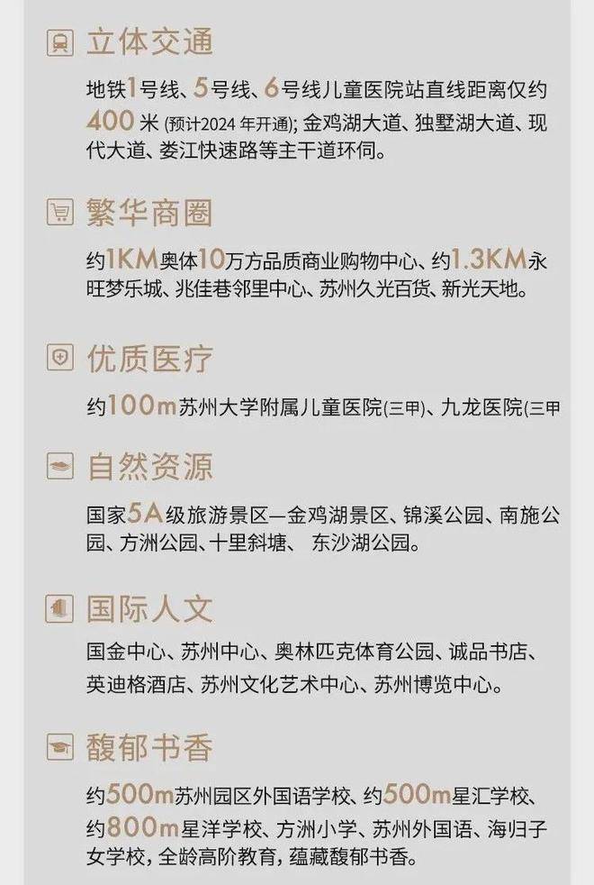 西揽繁华商业: 国金中心、中环广场(在建) 等国际级商业地标东邻产研高地: 大金、恒瑞医疗等全球知名企业汇集南承国际盛事: 苏州奥体中心北拥“城市绿肺”: 白塘公园、东沙湖生态公园海归人才子女学校、德威英国国际学校、园区外国语学校3大国际学校,链接世界新知紫金·翡丽甲第成为苏州园区不可复制的时代高地
