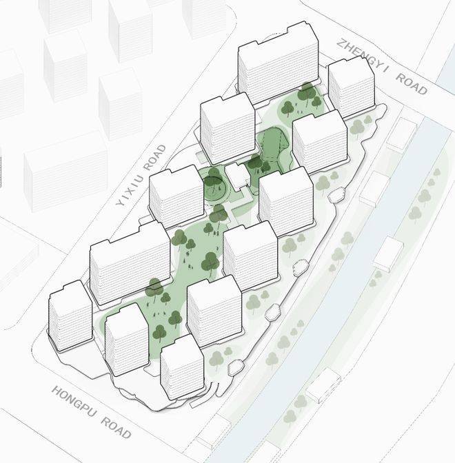 作为杭州首批采用新设计指南的项目,杭序府项目设计上整体往上抬升了约3.0米,摆脱围墙的视野遮挡,形成俯视景观的效果,与南侧河岸景观互通。地块主要由12栋13F-16F住宅及配套用房、架空车库组成,打造出纯粹的板上花园浮岛住区。