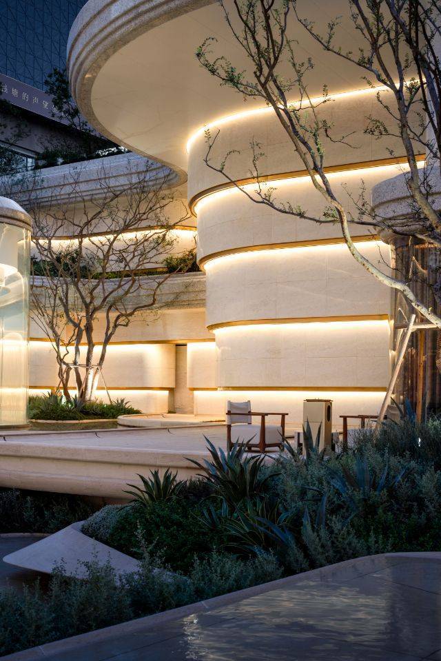 项目示范区整体延续这一设计理念,从入口大门到下沉庭院,总体布局灵感源自峡谷意象,以中央大花园为核心展开,以层层蜿蜒的大理石勾勒峡谷般的流动感。叠级曲线设计仿若水纹,营造出富有层次感与自然韵律的空间体验。