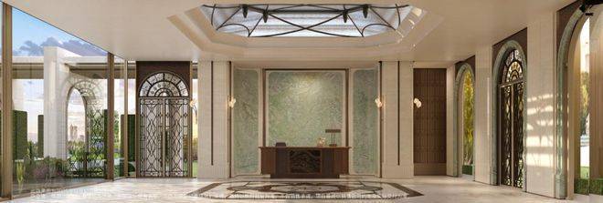 保利外滩曜售楼处电话:400-8818-994(官方售楼处电话) 社区主入口复刻华尔道夫酒店仪式,严谨的柱廊序列在米色石材上投下充满韵律的光影,穹顶与拱券,瞬间将归家情绪升华至艺术层面。