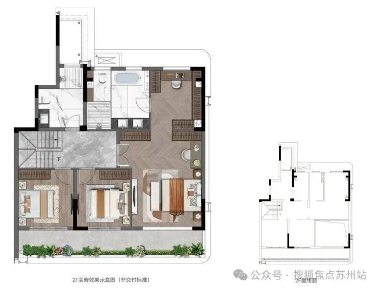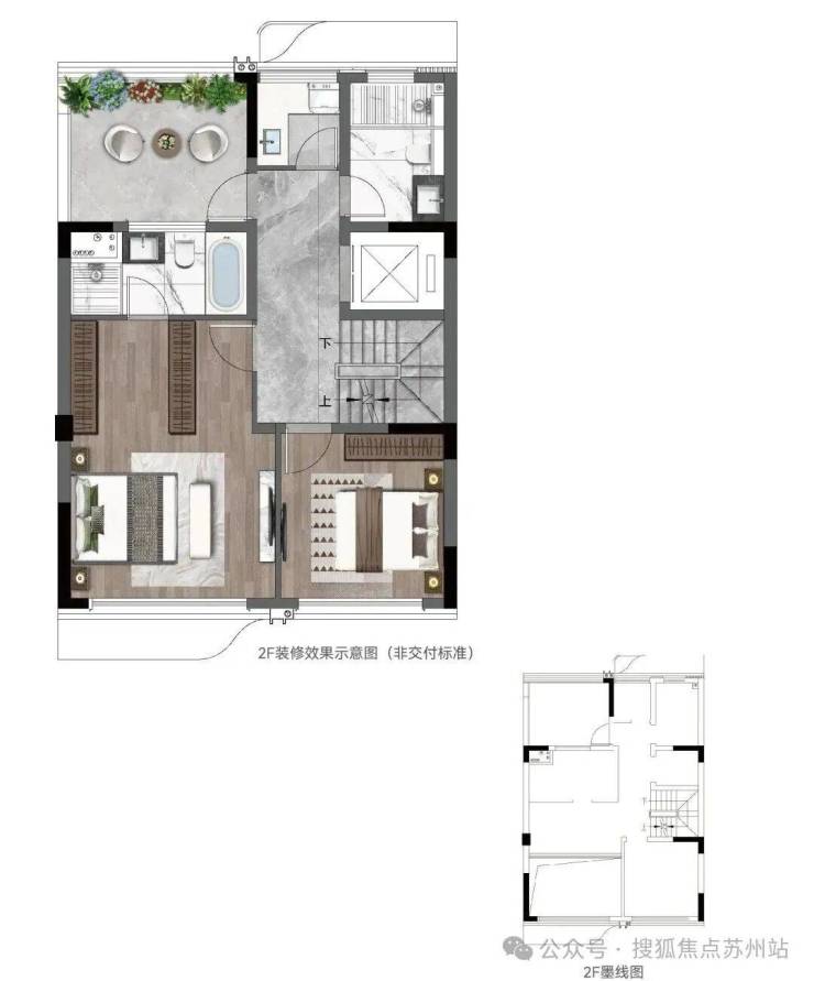 二楼朝南套房+朝南次卧,预留客卫+家政间,朝北带露台;