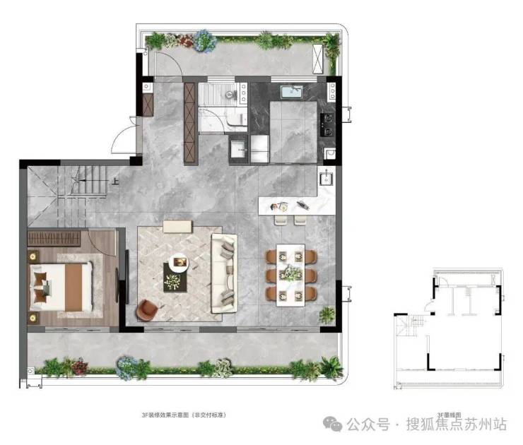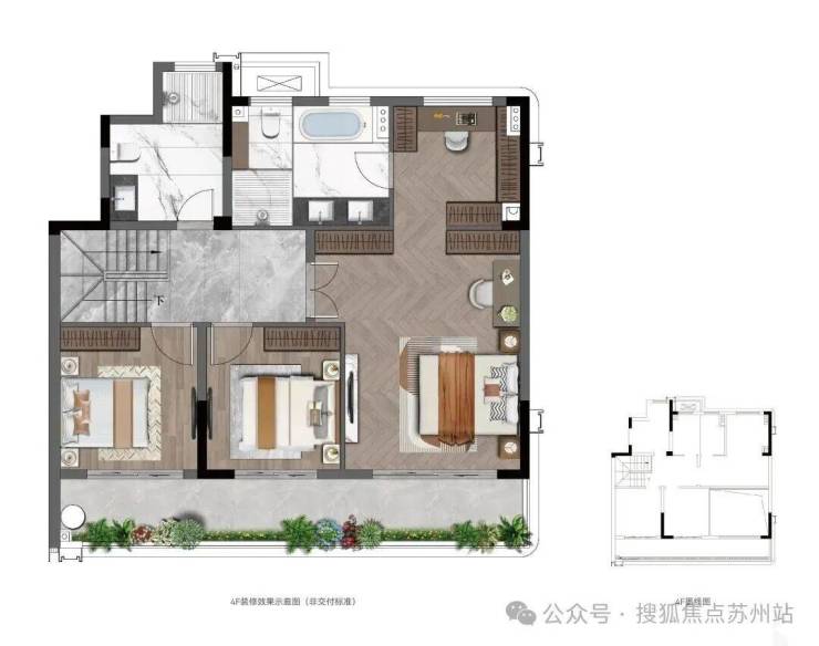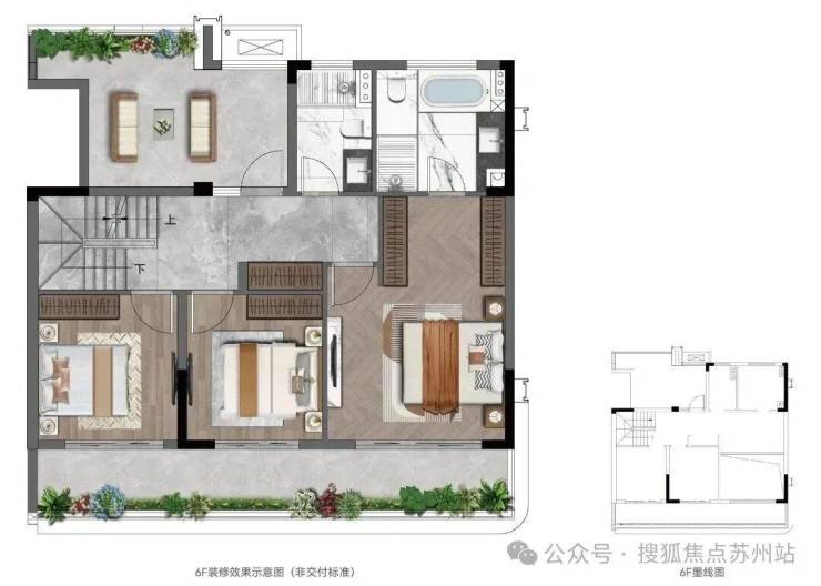 三楼是超大行政套房,并带了了一大露台,同时还赠送一个无需二次改造的顶层露台。