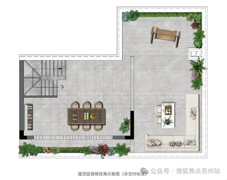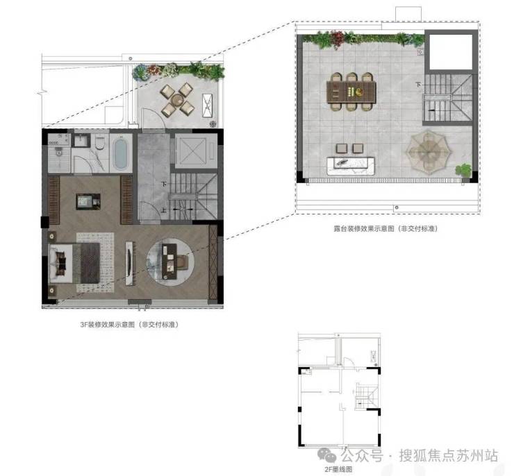 建面约169㎡上叠,4房2厅3卫,一层采用LDKB一体化设计,形成轩敞开阔的公共活动空间,二层南向三卧室连接三联阳台,延展室内空间,北面配备约30㎡观景露台,更有约55-60㎡星空屋顶花园,可打造家庭烧烤区、观景台、花园等。