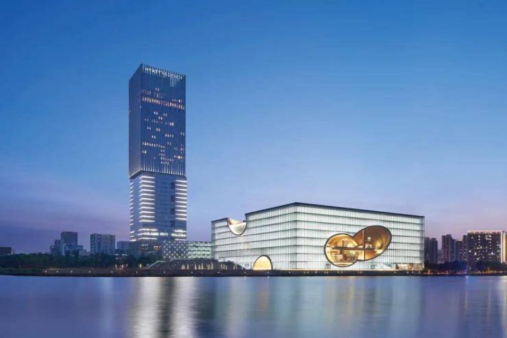 外立面采用了游艇级弧形铝板切割工艺,结合大面积的玻璃,是“游艇”美学建筑的理想材料选择,让建筑天生就拥有未来感、通透感,流线型的立面效果也与远香湖的水岸线形成视觉共鸣。