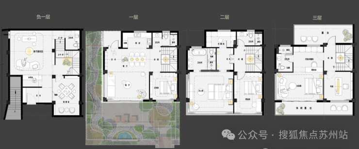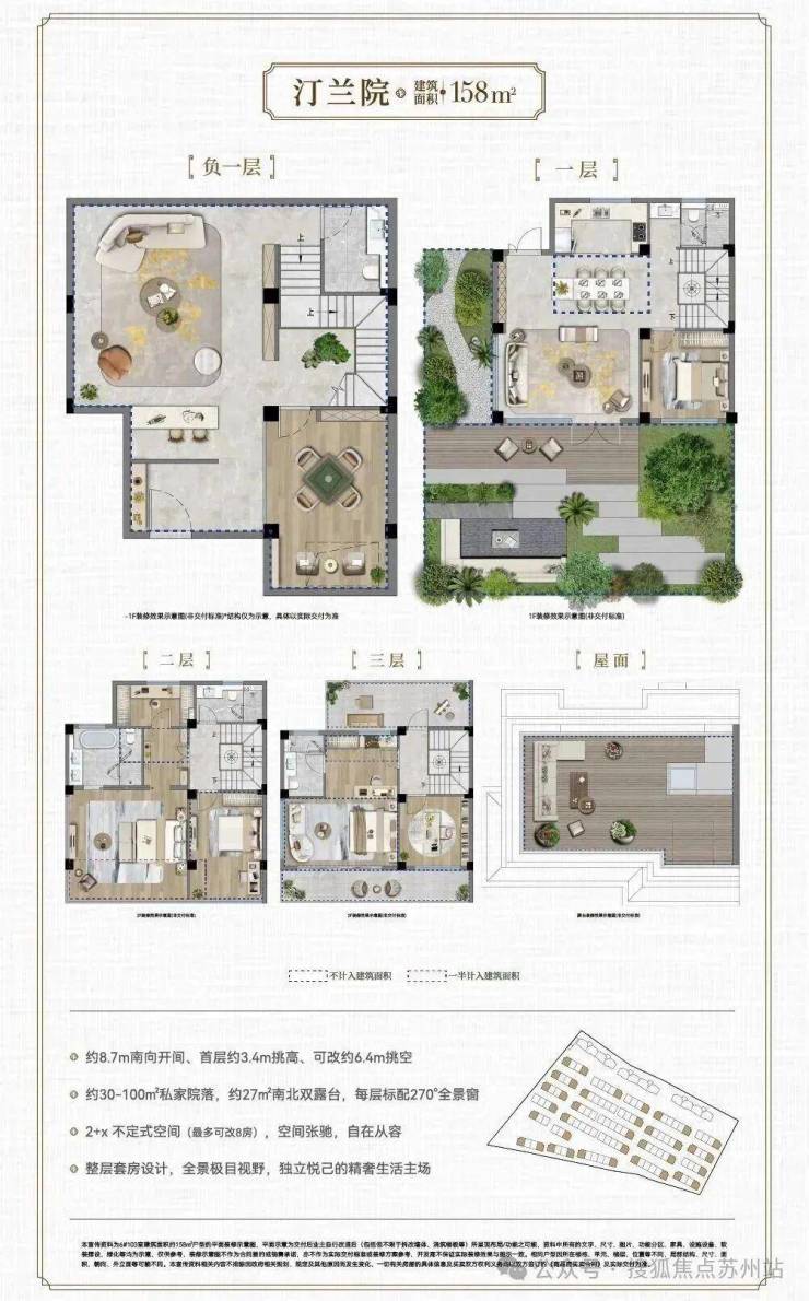 院墅臻品:建面约133-158㎡,采用香山帮传统匠艺,融合苏州园林精髓,打造三进归家礼序和六重画境1。
