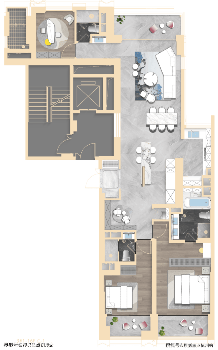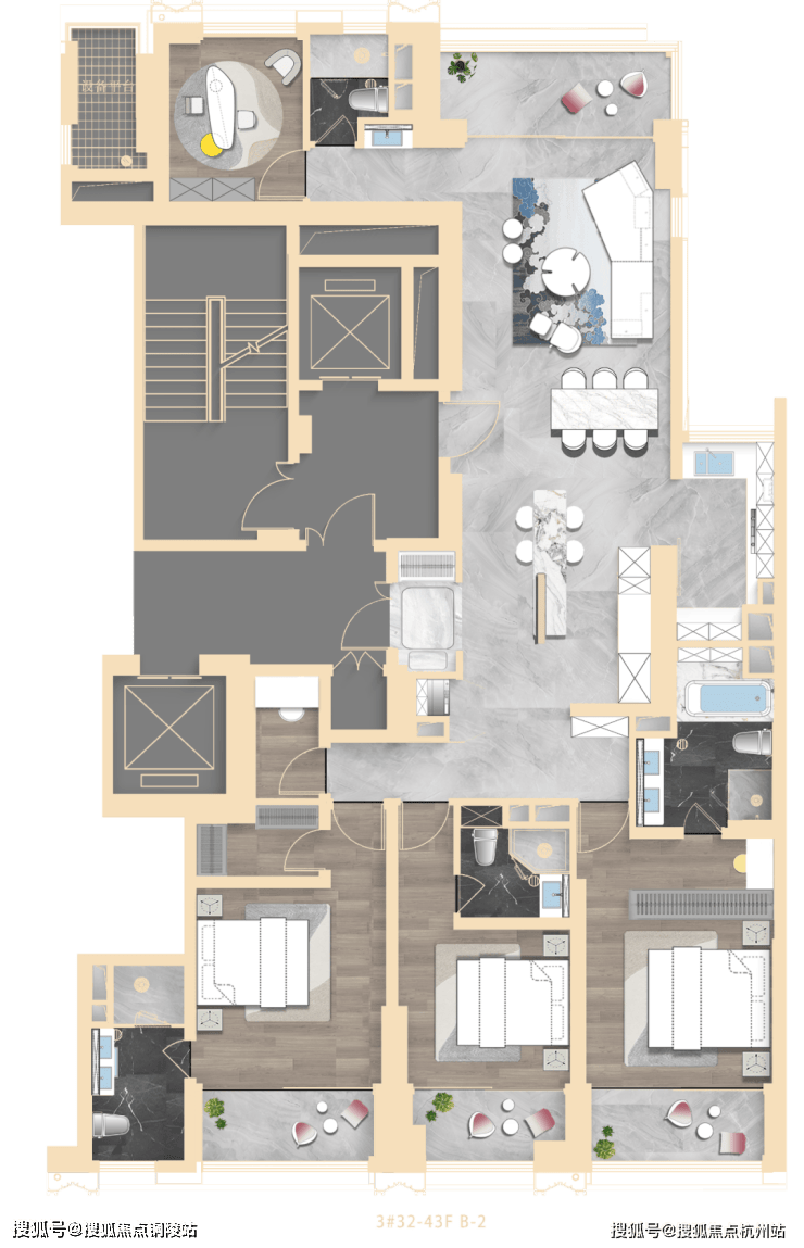 项目中心坐落的中央景观规模约3000㎡,周边环绕着四座建筑,其中三幢为超高层设计,整体布局高低兼顾,启承有序,开阖有度,塑造城市云端生活新方式。