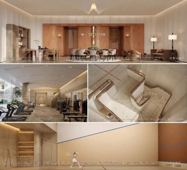 艺术旋转楼梯、地下光厅、区域首创国标壁球馆、飞瀑园景健身房、嵌入式景观书吧等,深度还原度假酒店质感