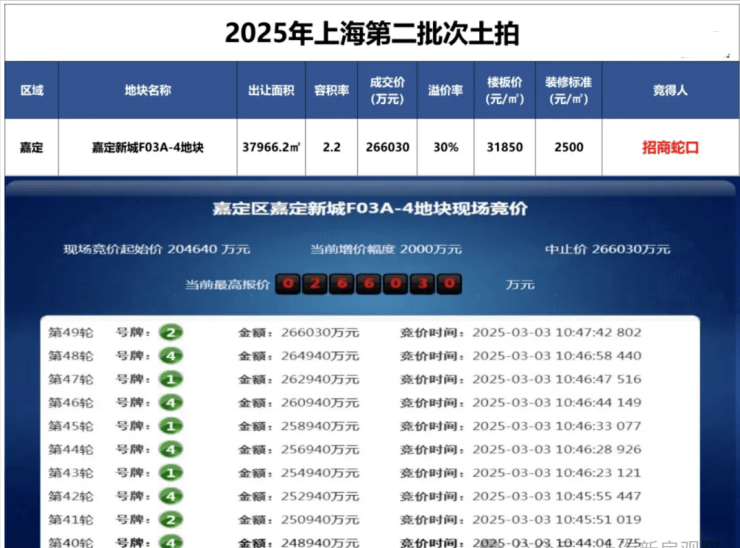 3月3日,上海2025第二批次土拍,经过49轮竞价,招商蛇口以266030万元的总价摘得嘉定新城远香湖F03A-4地块,溢价率30%,成交楼板价约31850元/㎡。