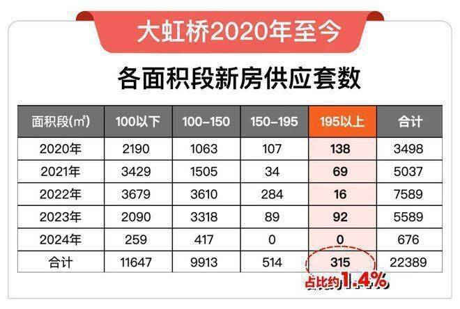 虹桥润璟售楼处电话/地址:400-838-5958【预约☎】2020年至今,大虹桥共供应22389套新房,其中建面约195㎡以上户型仅315套,今年为止更是0供应(截至2024.4.9),占比只有约1.4%。