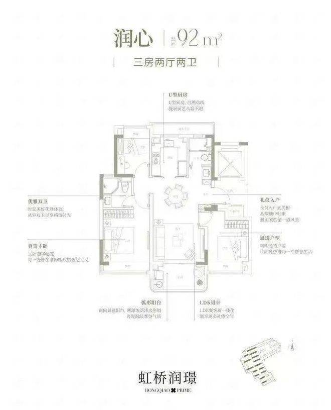 虹桥润璟售楼处电话/地址:400-838-5958【预约☎】飞机户型设计没有动静分区专属的“室内连廊”,空间利用率高;同时还能做到真正南北通透,南接不封闭瞰景阳台(不封算一半建筑面积),厨房北侧无连廊(采光、隐私更好),再叠加很大的窗墙比,进一步放大室内的采光、通透性!