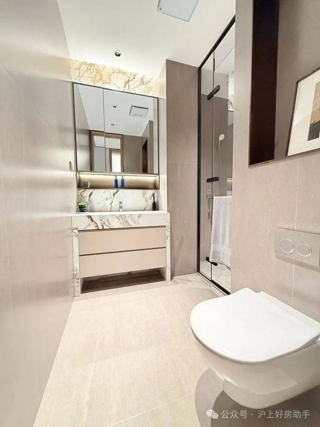 这个是入户玄关处的地面,大理石地面搭配金属线条勾勒出玄关地界,归家的氛围感从这个区域就开始了~这还不是重点,玄关座椅背后,是一面皮革包裹的墙面。鞋柜下方做了悬浮处理,同样也是内嵌灯带,这里灯光的角度还会再调整,因为灯光映射在大理石地面上,要显得尽量柔和不刺眼;同时,鞋柜下方可放拖鞋,还能放扫地机器人,便于日常清扫打理。鞋柜的饰面,纹路方向统一,呈现出极强的协调感。橱柜作为强功能性的收纳系统,自然少不了操作性能上的考究,吊柜做了升降式的拉篮,以后再也不用爬上高凳拿取了。下方的橱柜则做了转角拉篮,充分利用转角空间,使物品井然有序的同时,轻松方便取放。水槽也是一个大单槽,放得下炒锅汤锅这种大物件~抽拉式龙头,清洗大水槽的时候很方便,360度旋转伸展自如,这款弯管还是硅胶材质,柔软耐用有弹性,还可切换出水模式,出来的水柱也是很柔和细腻不飞溅。厨房玻璃门是上轨道移门,意味着地面部分没有任何轨道,不会有灰尘积攒,炒菜时关上,避免油烟散入室内;平时拉开,可以扩充室内视觉感受。卫浴缦云上海所有户型的所有卫生间里都用了悬浮式的洁具和柜体,确保了下方空间的打扫无死角,对未来的入住带来非常大的便利性!吉博力同层排水技术,静音是最大亮点;特制“水母”地漏,多重防臭防反溢。干净舒适的卫生间,是从空气到水流的全面把控~你们可以看下缦云上海是如何处理卫生间木门的防潮的——卫生间一侧用大理石做踢脚线,这是真正细致入微的巧思!主卧卫生间配备的电热毛巾架简直就是遇到潮冷节气的“福音”,让毛巾、内衣都能够提前加热干燥。层高对于缦云上海的纯大宅社区定位,能买这样产品的购房者会非常在意空间感。缦云上海全部户型层高约3.3米,室内所有空间的门都做了通顶设计,更阔绰的居室空间,将生活格局有效放大,通风、采光和观景体验的全方位提升!弧形元素缦云上海样板间里随处可见柔和的圆弧修饰,特别是柜体、墙体包边的圆弧转角,在进出各个空间时,减少磕碰的风险,对于有孩子和老人的家庭来说,是非常实用的友好设计。而且,门套做了弧形设计后,还叠加了金属线与墙纸做了分割,加强隔断界限感,提升室内家居精致度~比起中规中矩的直线,弧形施工工艺更复杂、造价更高,却多了几分灵动轻盈!这种弧形的元素不只是在样板间里,在售楼处也能经常看到,比如电梯厅。「缦云上海」售楼处电话:400-8123-664