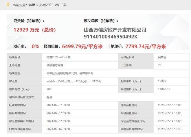 光信香雪雅院,即,苏地2023-WG-3号地块,位于吴中区光福镇苏福路北侧、福锦路西侧,是2023年2月16日,山西万信房地产开发有限公司以底价12929万元拿下,成交楼面价6500元/平