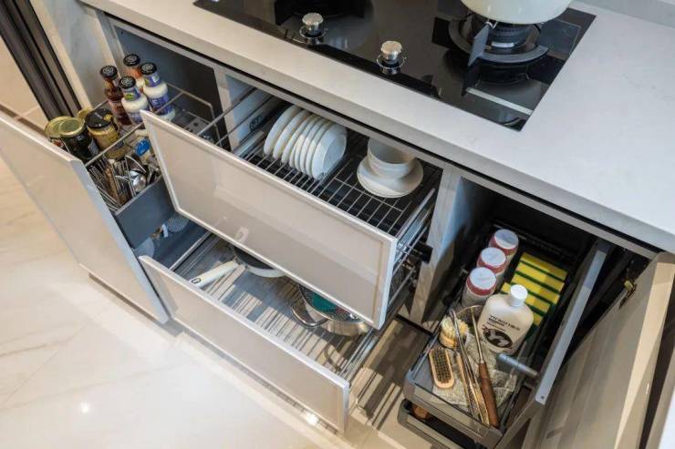 厨柜采用考究的烤漆面板,橱柜内配置了4种拉篮——抽屉式碗碟拉篮、窄边拉篮、天使拉篮、斜抽拉篮(统称魔术拉篮),锅碗瓢盆等皆可纳入其中,高效利用空间。
