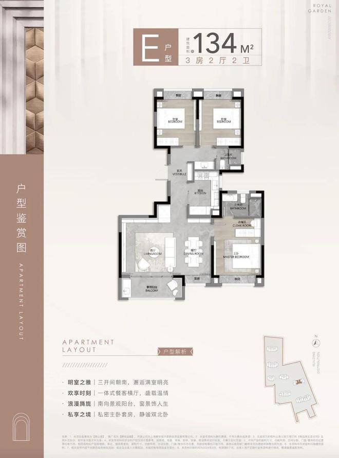 165㎡四房:270°端厅设计,双主卧配置。