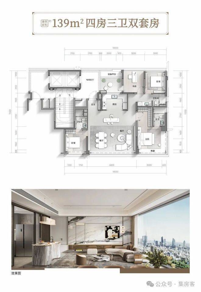 保亿君潮润府139㎡4房3卫户型做到四室三卫的同时室内实际空间使用率高达97%,南向面宽约14米,客厅6.8米南向面宽;连接北侧的书房、北阳台、私家电梯厅,可形成一个可以植入更多生活场景的大洄游动线空间