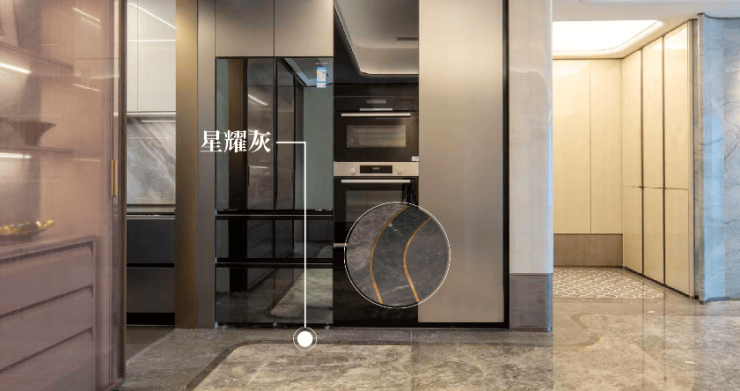 铺陈客厅的灰调石材,以“铜流金镶”工艺进行围合,两种不同灰度的天然奢石完美融合,细腻雅致的鱼肚灰、星河般璀璨的星耀灰,成为客厅一道不可多得的艺术风景。