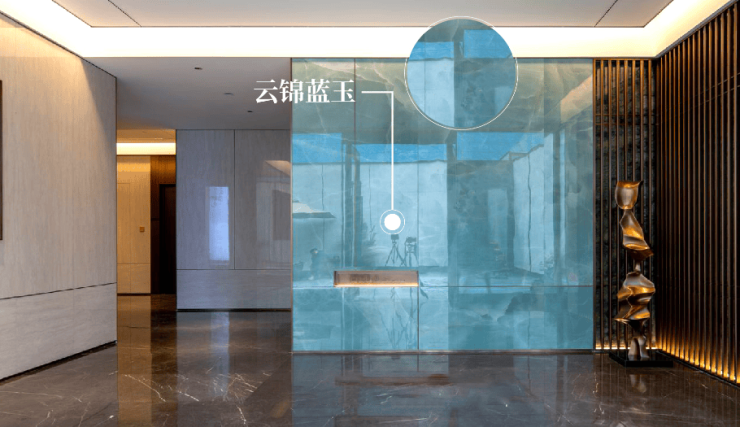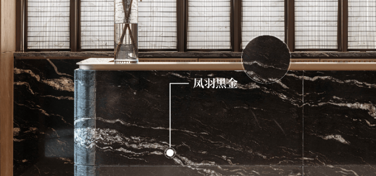 从众多名贵石材中臻选精品原石,最终以中国黑、凤羽黑金、祖母绿、巴西鱼肚白、鱼肚灰、温德姆灰、金沙蓝等十余款天然奢石,作为构建东方豪宅空间质感的艺术品。