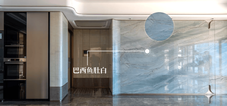 厦门华尔道夫酒店同款——巴西鱼肚白,铺陈出一面通顶的背景墙,成为整个空间的焦点。其颜色近似于鱼腹部颜色,仿佛如晨光微曦时东方神秘的天宇,赋予家浪漫与典雅的底色。