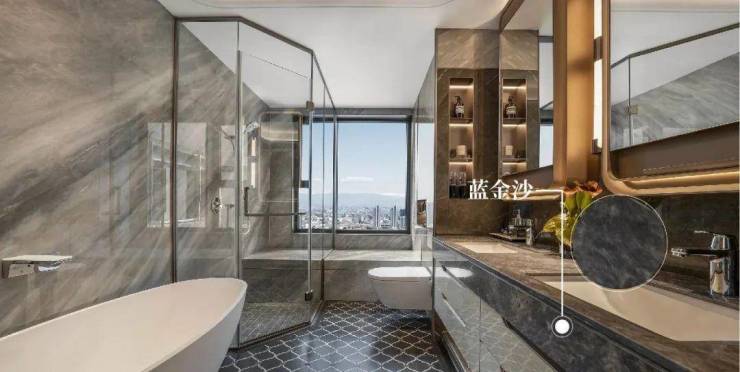 在卫浴间里,蓝金沙奢石铺就的台面充斥着浪漫与优雅的美感,繁星熠熠,漫若浮光,其独特的流沙质感纹理将卫浴的私密质感衬托得恰到好处,深受高端酒店的喜爱。