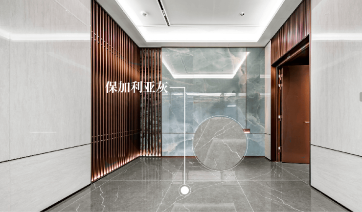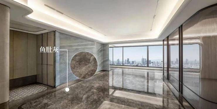 首层大堂的地面以保加利亚灰石材铺就而成,源自伊朗的深山矿脉,色调坚硬,色泽沉稳,与上海网红世贸深坑酒店的同款奢石相映成趣,更显奢宅的尊崇与典雅风范。