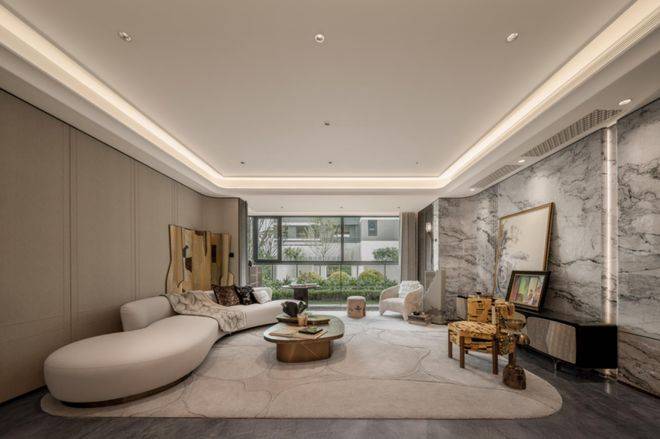 下沉式庭院则以土耳其进口老虎玉为基底,经匠人60天手工细细打磨;树龄超60年的福木「紫薇」,跨越万水千山从远方寻得,让每一次归家,都成为穿越艺术与时光之旅。