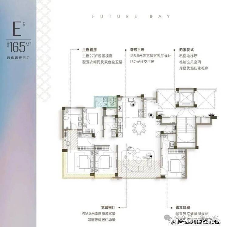 约165方户型,16.85米超大南向开间,超过市场所有同面积段产品;标配储藏间。