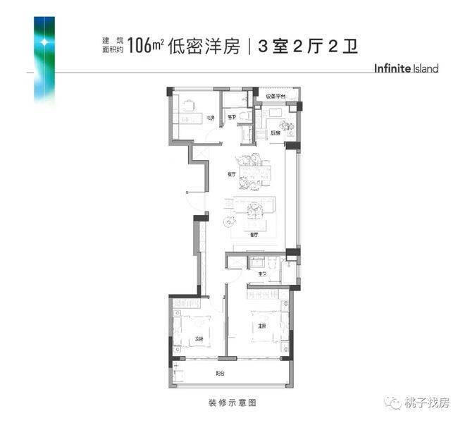 建面约106㎡的户型是市场上难得的小户型边套产品,南向双开间,同样的双联阳台打造,餐客厅一体化设计链接阔景飘窗,充分保证整个房间的采光面,后期居住舒适度更高。