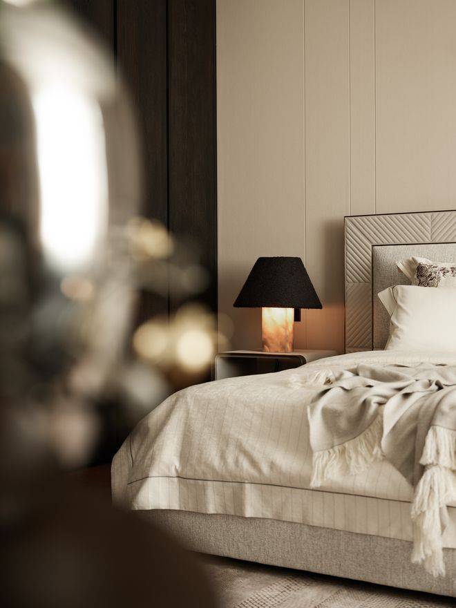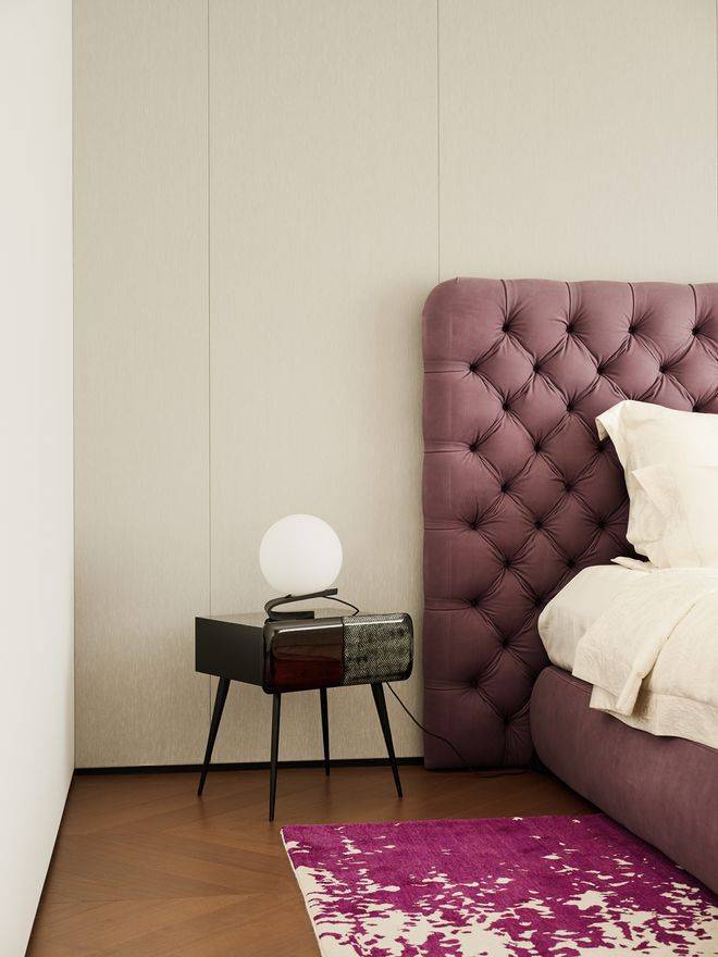三楼围绕家庭起居厅布置卧室。卧室的地毯是由黄亚兰原创设计的《流动的暮色诗境》,精致的家具与手工羊毛地毯温柔包裹新生家庭的私密时光。