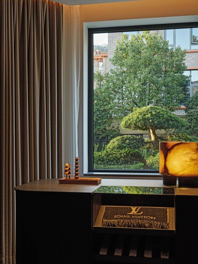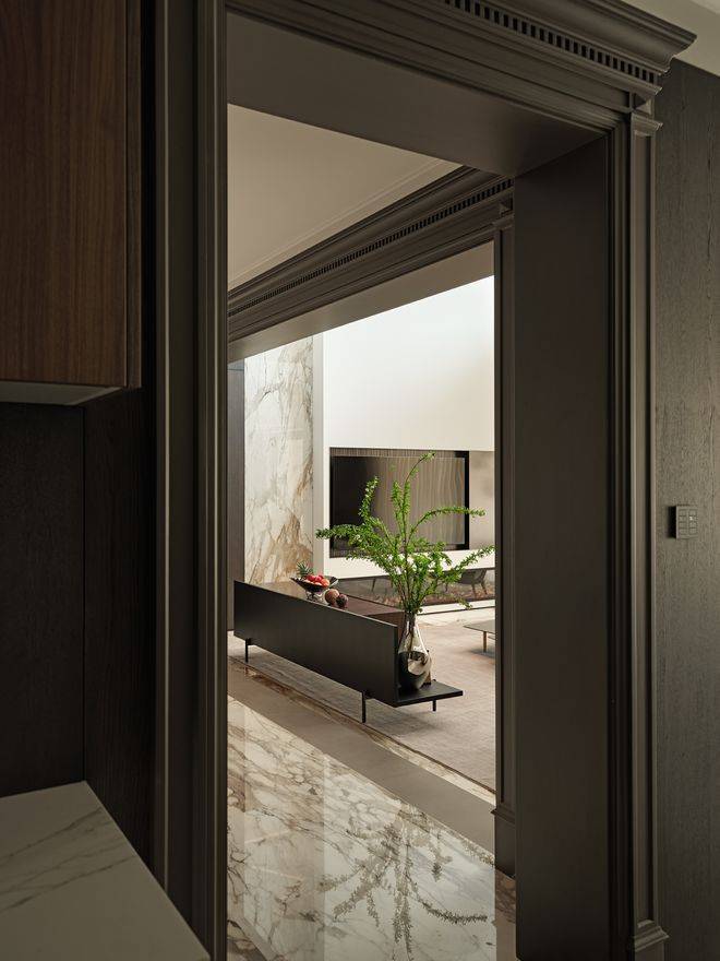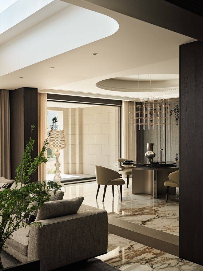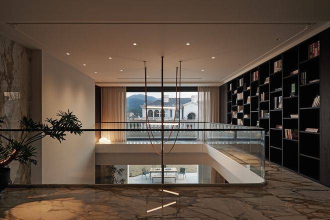 房子内部以“垂直生长”回应家族生命周期。一楼作为家庭社交中枢,6米多高的挑空客厅以卡拉卡塔金大理石纹为幕,石材纹理如水墨恣意流淌,灰色的手工地毯以“时光的褶皱”为精神内核,与Minotti的家具构成刚柔对话。