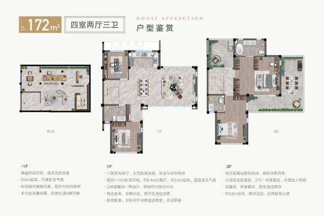 容积率仅0.41,绿地率50%,户均占地超300㎡。主力户型为建面98-172㎡的合院别墅,附赠50-200㎡私家庭院及双车位,采用L型合院布局实现270°环景采光。