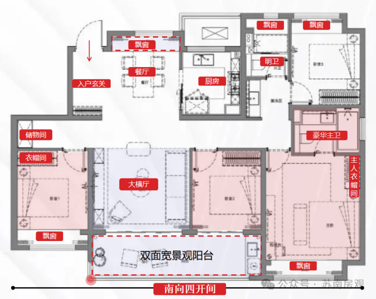 还有建面约143㎡四房两厅两卫,四开间朝南,每个功能空间都做到了均好性。