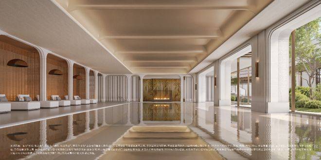 项目社区中央超大下沉式景观会所,恒温泳池采用落地玻璃幕墙,畅游时能欣赏窗外园林景观,堪比顶级度假酒店,另外健身房、私宴厅、书吧一应俱全!