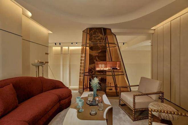 更加别具一格的设计在上方的负一层创意临展空间,透明的茶色玻璃壁炉贯穿于此,金属镶边与定制家具相应和,与华丽红沙发一道,应和着海派ArtDeco风情,延展出融合历史与文化格调的能量回旋。