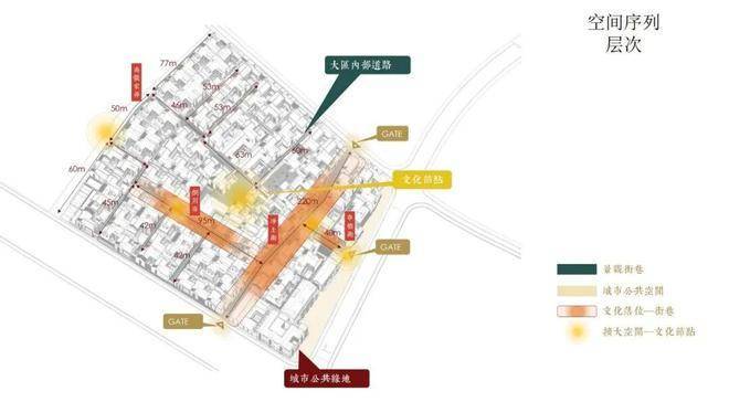 士林润园社区规划可分为蓬莱路城市公共景观以及社区内部景观两个部分,其中市政绿地衔接于上海2035城市总体规划中“蓝绿丝带”的上位条件要求,社区内部街巷空间形成空间序列形成递进的层次,将归家体验的序列依次展开,形成城市街道→入口(一级门户)→街巷→节点空间→里弄门(二级门户)→合院入户(三级门户)的方式,基本可保证大多数住户可体验到两重以上的空间递进。