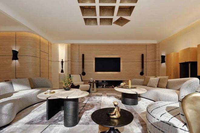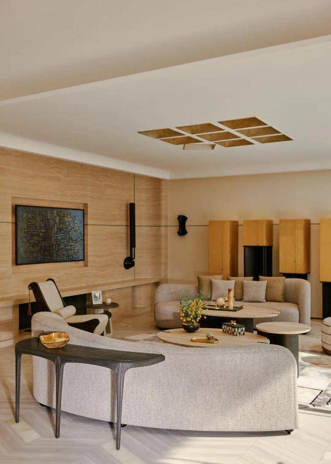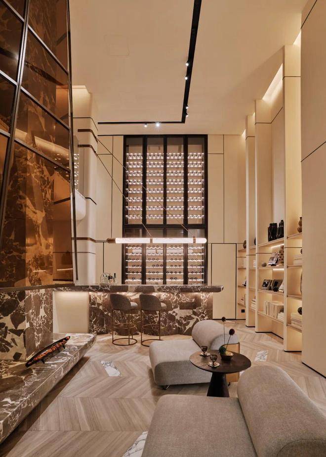 这一层更聚焦于私谈、影音、娱乐、品酒、饮茶,深沉又静谧。近6米高的垂直挑空玻璃壁炉矗立于眼前,如同一件令人赞叹不已的大型雕塑装置,它弱化了空间中的大理石承重柱,将其纳入共同构成一个完整的全新的装置,集功能性与艺术性于一身。