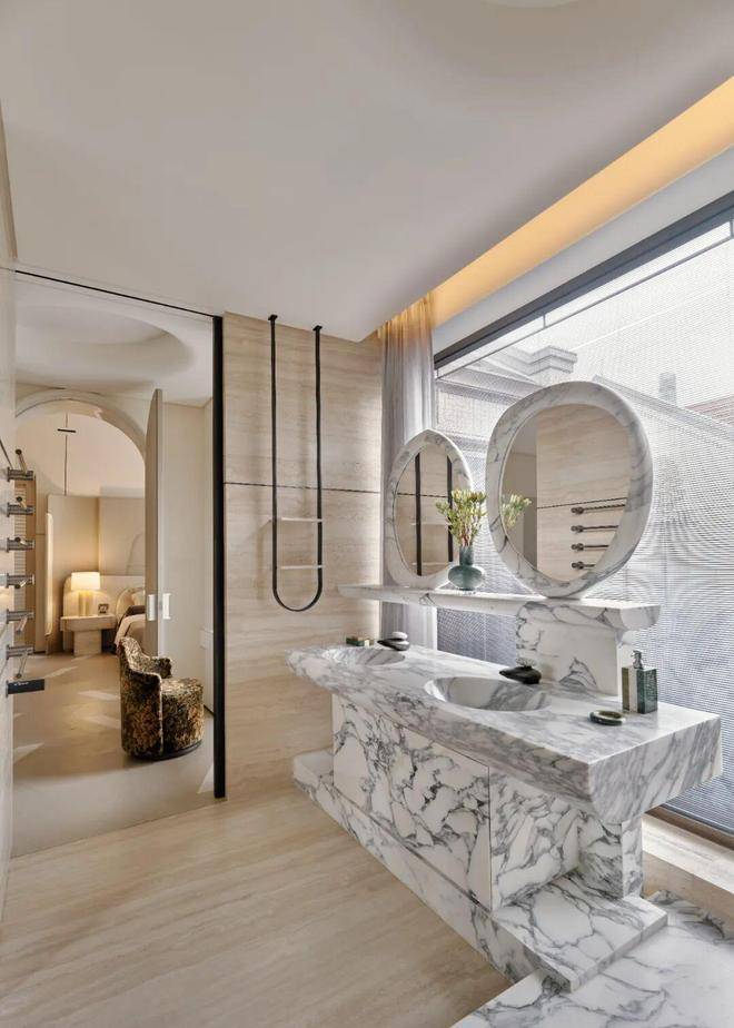 整体以米白色调为主,加入了少许鲜亮橘色,烘托休憩情绪。主卫浴采用双台盆设计,方便双人同时使用,由天然洞石打造的卫浴空间更具有一种低奢隐逸的度假气息。