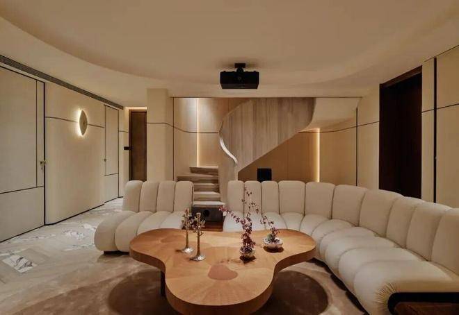 顺着弧形木质楼梯抵达地下空间,仿佛游走在一曲流动的乐章中。一切都共同呼应着水的特质,传递着低调隐逸情怀与圆融个性。