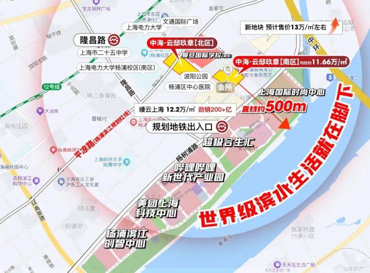 而你知道吗,五批次待拍宅地距离江面超过1公里,中海云邸玖章正在认购的南区距离江面直线仅约 500米 ,在一众杨浦项目中是翘楚。而且项目南面是上海国际时尚中心和杨树浦路电厂旧改项目,均是低矮建筑,意味着 项目的中高区房源能有一线滨江开阔视野。