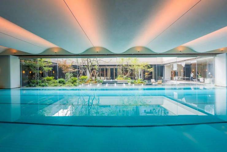 比起领邸,云邸玖章改为采用大尺度的落地玻璃 拼接, 且 通过精致的玻璃交接细节 处理 增进室内外空间的融合,强调泳池的无界感 , 真正实现了无边泳池的效果 。 通透感、无界感相较徐汇滨江会所的泳池又有了质的飞跃。