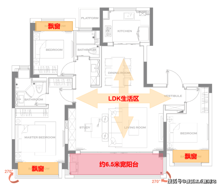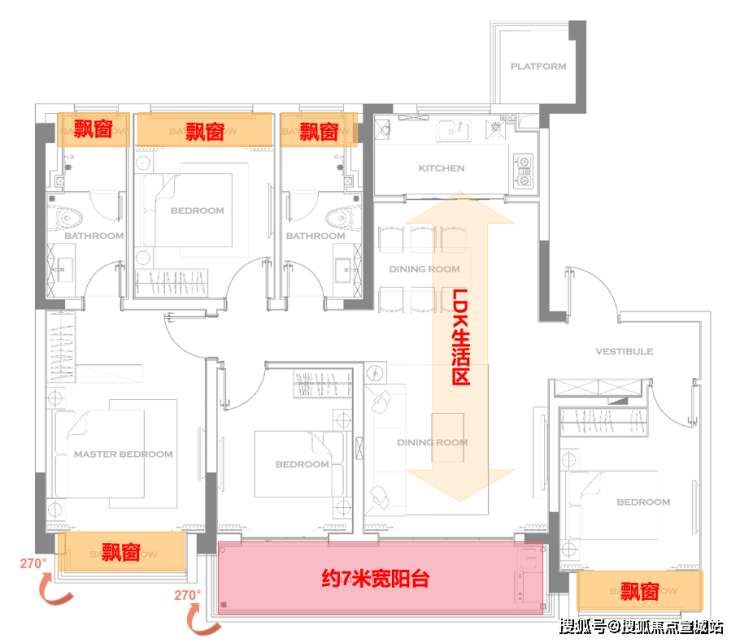 该户型以入户大玄关+大四房+多飘窗+270°转角阳台的设计,4开间朝南面宽13.6,客厅+次卧双阳台设计开间7米,主卧开间3.5米,右次卧开间3.1米.